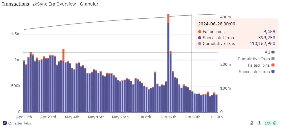 但与日活跃地址数类似,ZKsync Era网络的日交易笔数在6月16日空投当天达到了历史新高,约170万笔。随后日交易笔数下跌,与空投前平均日交易笔数相比约减少50%。