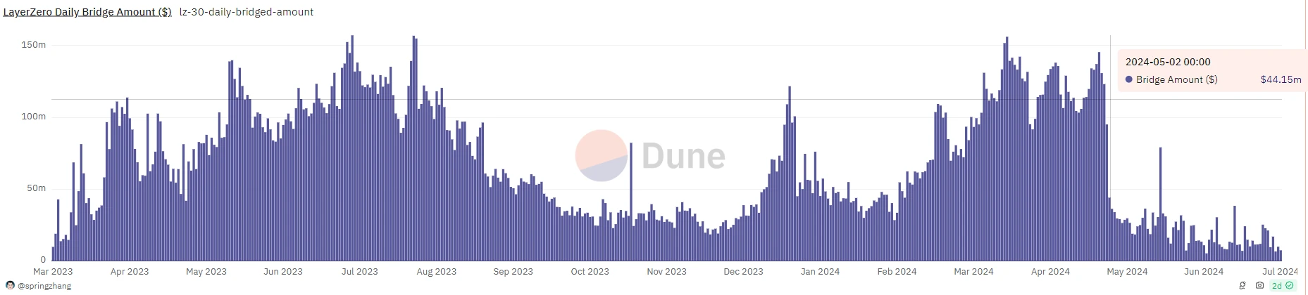 根据Dune数据,每日使用LayerZero进行跨链的资金在官方宣布快照后骤降,每日平均保持在1500万美元左右,与空投前高峰期相比,减少了90%以上。