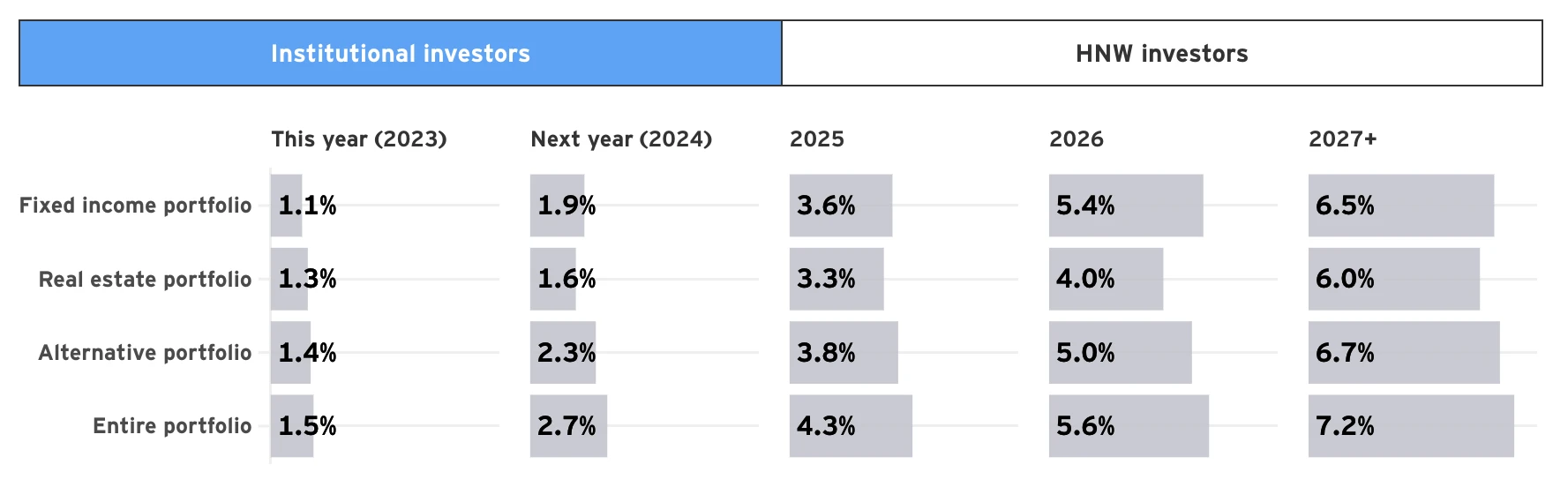 美国代币化政府债券的市值也从 2023 年的 1.14 亿美元增长到 8.45 亿美元,Franklin Templeton(富兰克林邓普顿)是这一资产类别的最大发行者,占市场的约 38% 。安永(EY)的最新研究表明, 64% 的高净值投资者和 33% 的机构投资者计划在 2024 年底前增加对代币化国债的投资。