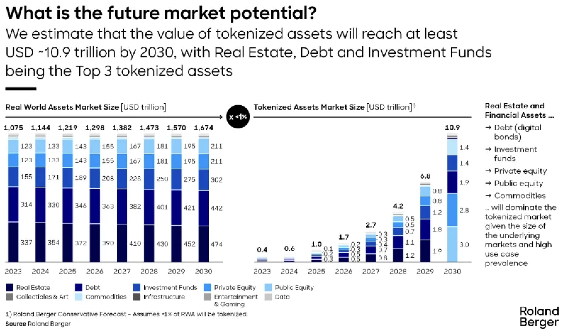 BlackRock 的 CEO Larry Fink 认为代币化是金融的未来和市场的下一步演变,他的这一立场可能会影响其他主要金融游戏参与者的态度。正如我们在之前关于 Dusk Network 的研究中所强调的,Real World Assets(RWA,真实世界资产)正在成为加密货币行业中的重要资产类别。截至 2024 年 5 月,RWA 市场已超过 66 亿美元,反映了投资者对这一创新金融产品的日益兴趣。将 RWA 代币化并将其引入区块链可以在 DeFi(去中心化金融)中提供收益机会。资产代币化市场预计到 2030 年将达到 10 万亿美元。