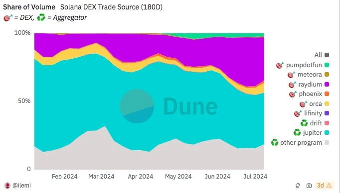 通过此图可以证明 Jupiter 在 Solana 中 DeFi 的重要性。随着 Solana 上 meme 浪潮的盛行,Solana 的交易量稳居榜首,那么 Jupiter 自然在聚合器的领域上独占鳌头。