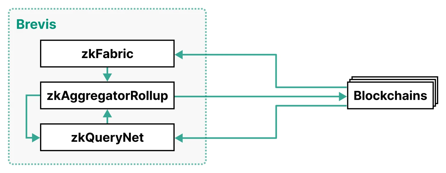 zkFabric:zkFabric 是 Brevis 架构的中继器。它的主要任务是收集并同步来自所有连接区块链的区块头信息,最后通过 ZK 轻客户端电路为每个收集的区块头生成共识证明。