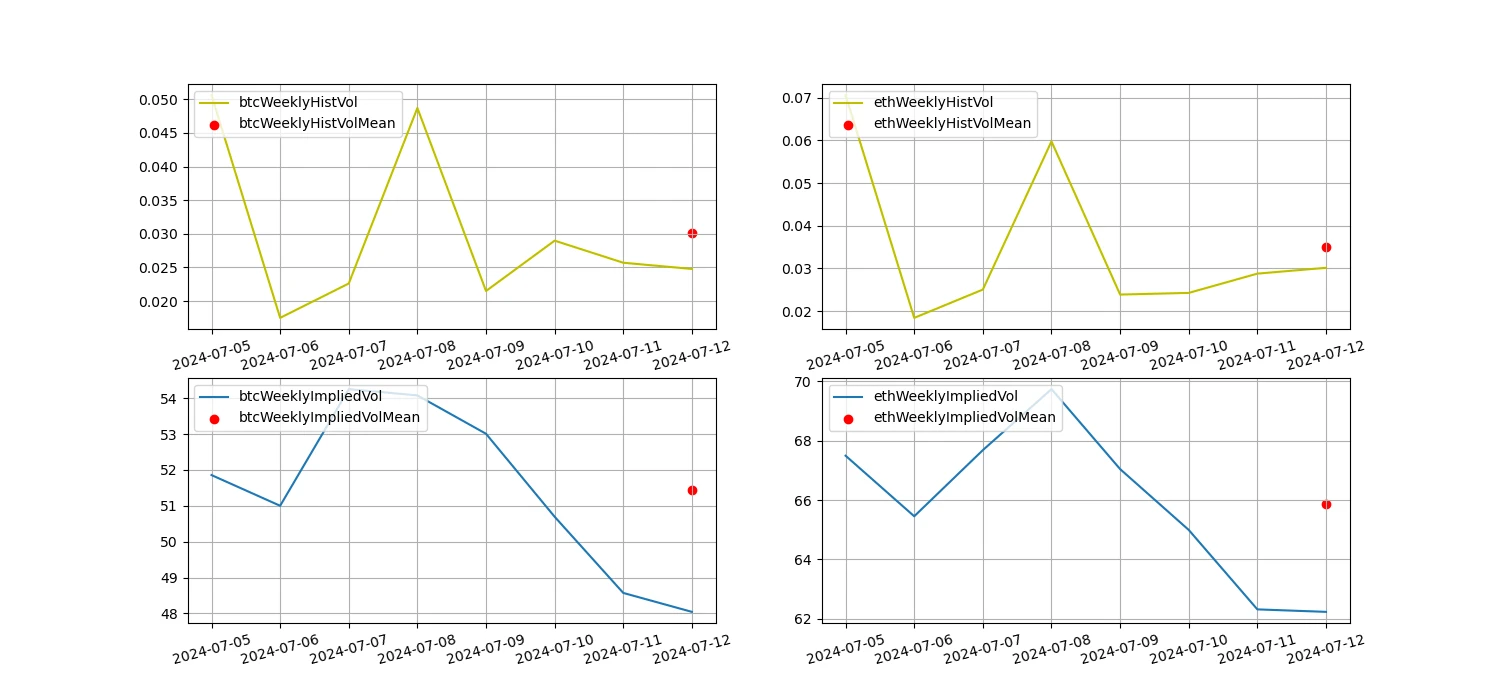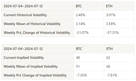 过去一周历史波动率 BTC 与 ETH 在 7.5 下跌时最高;隐含波动率 BTC 与 ETH 同步下降。