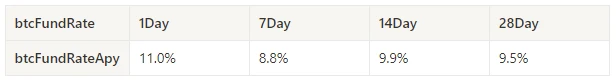 过去一周 BTC 资费平均年化收益为 8.8% ,合约杠杆情绪维持较低水平。