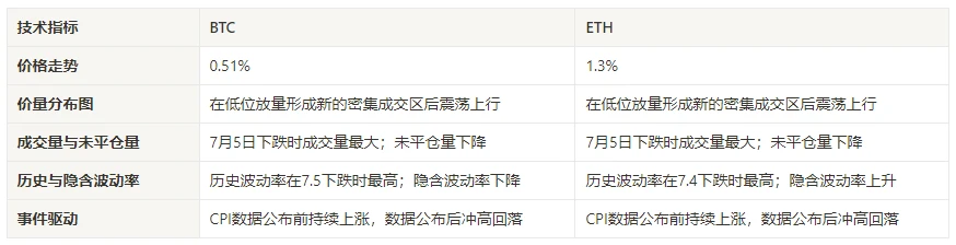 在过去一周,比特币(BTC)和以太坊(ETH)的价格在低位放量后震荡上升,同时这两种加密货币的波动率和成交量在 7 月 5 日的下跌到低点时达到了最高水平。比特币和以太坊的未平仓合约量都在下降。此外,比特币与以太坊的隐含波动率也同步下