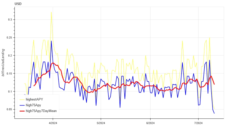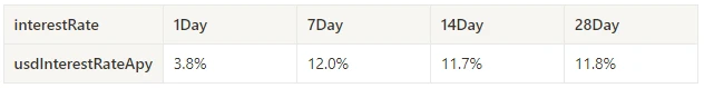 过去一周 USD 放贷年化收益平均为 12% ,短期利率下降至 3.8% 。