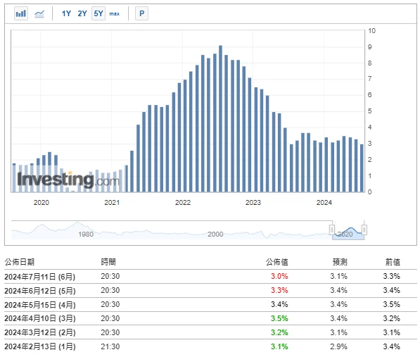 年内降息预期大幅升温, 9 月首次降息的可能性回升至 80% , 7 月降息概率重现。比特币与以太坊价格在 CPI 数据公布前持续上涨,数据公布后冲高回落。美国劳工部公布的数据显示, 6 月份美国消费者价格指数(CPI)同比增速由 5 月的 3.3% 放缓至 3% ,为去年 6 月以来最低增速;环比由 5 月的持平,转为 6 月的下降 0.1% ,增速较上月回落 0.1 个百分点,为 2020 年 5 月以来的首次负增长,显示出通胀继续放缓的迹象。