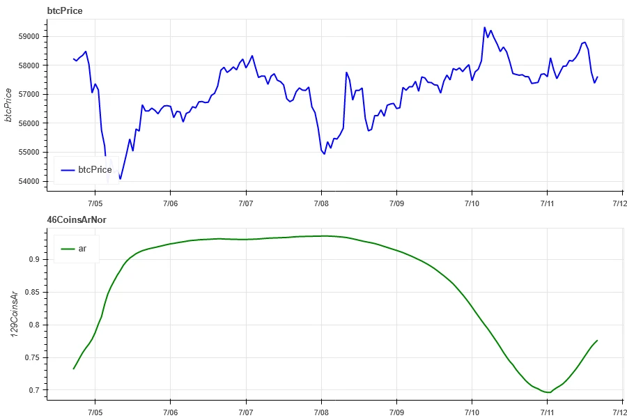 上图蓝色先为比特币价格,绿色线为['1000 floki', '1000 lunc', '1000 pepe', '1000 shib', '100 0x ec', '1inch', 'aave', 'ada', 'agix', 'algo', 'ankr', 'ant', 'ape', 'apt', 'arb', 'ar', 'astr', 'atom', 'audio', 'avax', 'axs', 'bal', 'band', 'bat', 'bch', 'bigtime', 'blur', 'bnb', 'btc', 'celo', 'cfx', 'chz', 'ckb', 'comp', 'crv', 'cvx', 'cyber', 'dash', 'doge', 'dot', 'dydx', 'egld', 'enj', 'ens', 'eos','etc', 'eth', 'fet', 'fil', 'flow', 'ftm', 'fxs', 'gala', 'gmt', 'gmx', 'grt', 'hbar', 'hot', 'icp', 'icx', 'imx', 'inj', 'iost', 'iotx', 'jasmy', 'kava', 'klay', 'ksm', 'ldo', 'link', 'loom', 'lpt', 'lqty', 'lrc', 'ltc', 'luna 2', 'magic', 'mana', 'matic', 'meme', 'mina', 'mkr', 'near', 'neo', 'ocean', 'one', 'ont', 'op', 'pendle', 'qnt', 'qtum', 'rndr', 'rose', 'rune', 'rvn', 'sand', 'sei', 'sfp', 'skl', 'snx', 'sol', 'ssv', 'stg', 'storj', 'stx', 'sui', 'sushi', 'sxp', 'theta', 'tia', 'trx', 't', 'uma', 'uni', 'vet', 'waves', 'wld', 'woo', 'xem', 'xlm', 'xmr', 'xrp', 'xtz', 'yfi', 'zec', 'zen', 'zil', 'zrx’]整体的相关性