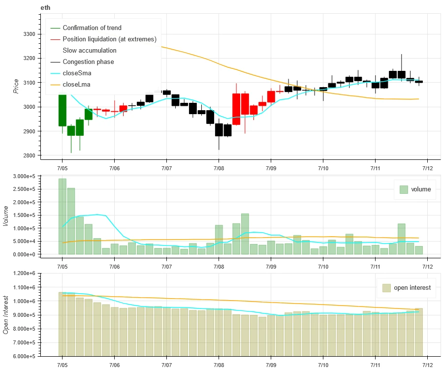 上图最上方 ETH 的价格走势,中间是成交量、最下方是未平仓量、浅蓝色是 1 天均值,橘色是 7 天均值。其中 K 线的颜色代表当前的状态,绿色是价格上升有成交量支持,红色是在平仓,黄色是在缓慢累积仓位,黑色是拥挤状态。
