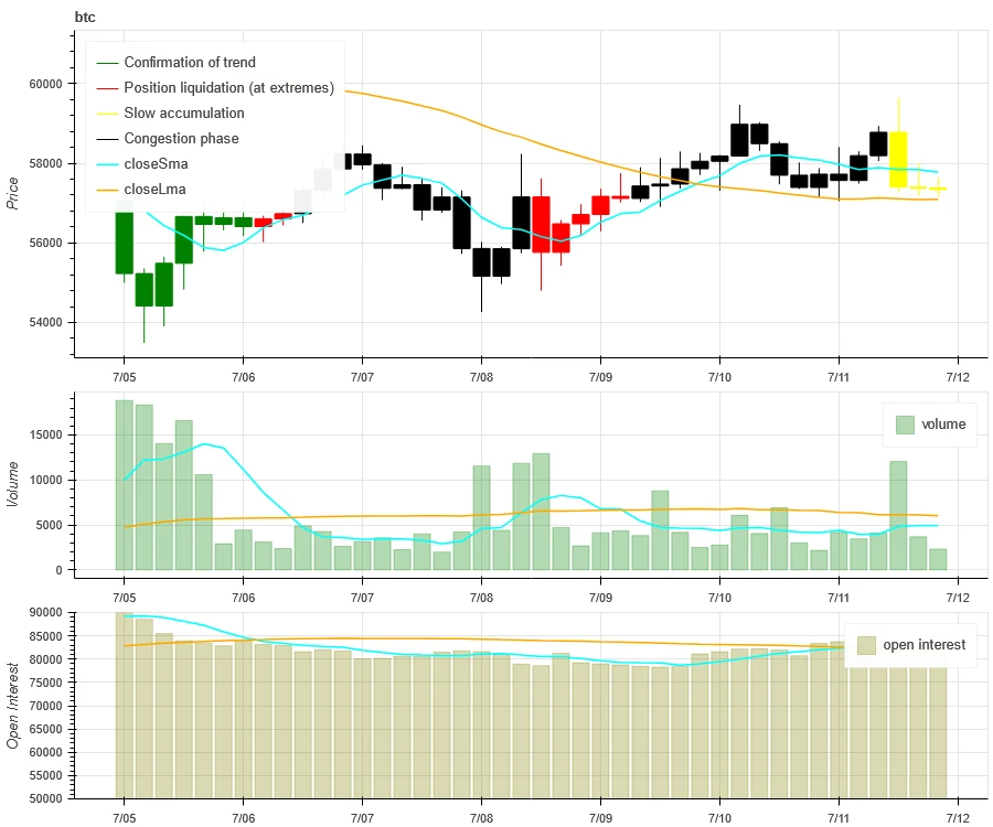 上图最上方 BTC 的价格走势,中间是成交量、最下方是未平仓量、浅蓝色是 1 天均值,橘色是 7 天均值。其中 K 线的颜色代表当前的状态,绿色是价格上升有成交量支持,红色是在平仓,黄色是在缓慢累积仓位,黑色是拥挤状态。