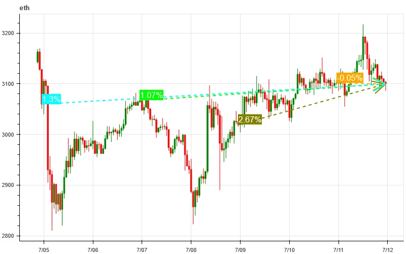 过去一周比特币与以太坊价格在 CPI 数据公布前持续上涨,数据公布后冲高回落。