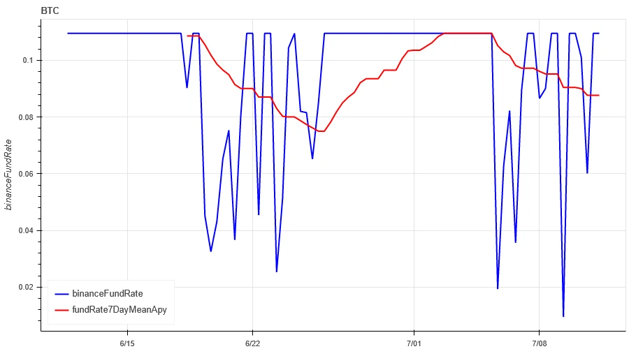 蓝色线为币安上 BTC 的资金费率,红色线为其 7 日平均