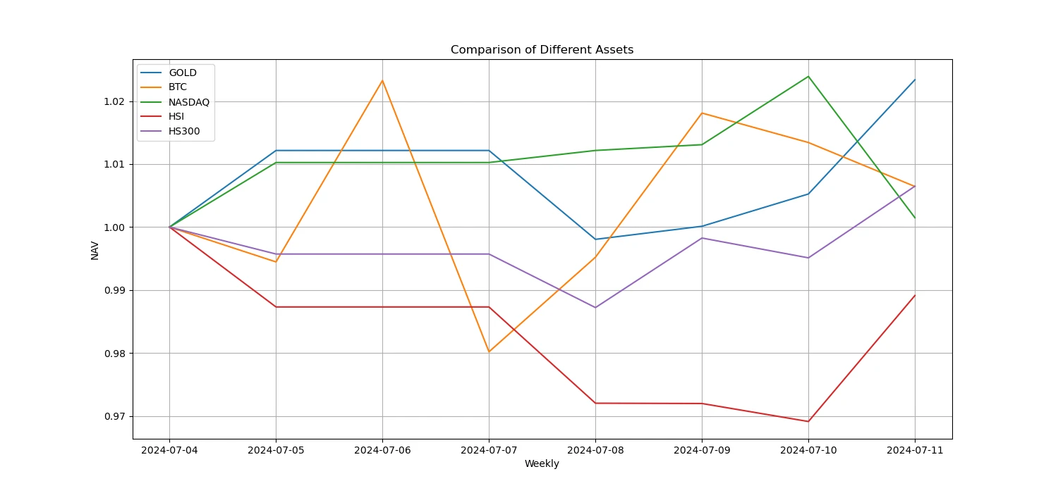 过去一周比特币/黄金/纳指/恒指/沪深 300 中,黄金最强势,而表现最差为恒指。