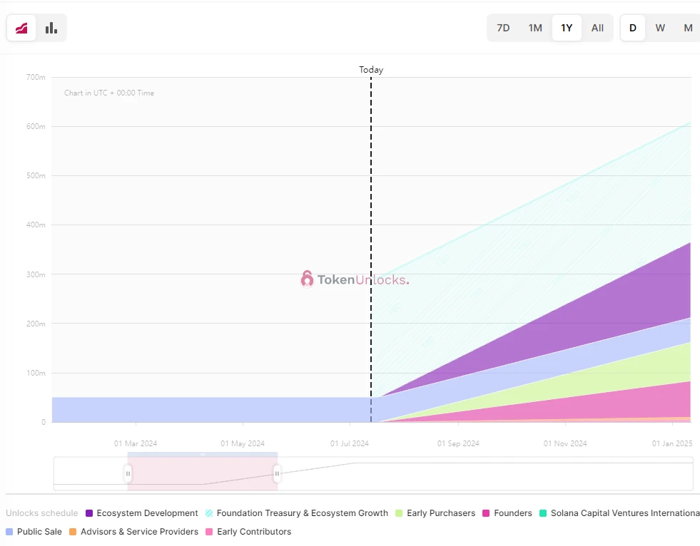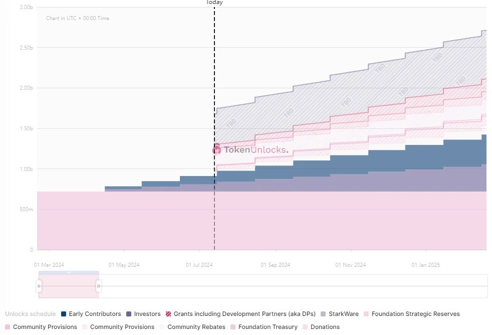 STRK 当前流通量占总量的 9% ,抛压依旧较强,本轮释放对象包括早期贡献者 3357 万枚(价值 1882 万美元)、投资者 3043 万枚(价值 1706 万美元)。