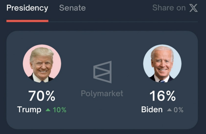 目前,媒体评论与社群风向皆表明,这次枪击事件将提升川普赢得总统选举的机率,根据 Polymarket 预测数据,押注川普胜选机率已达到 70%。