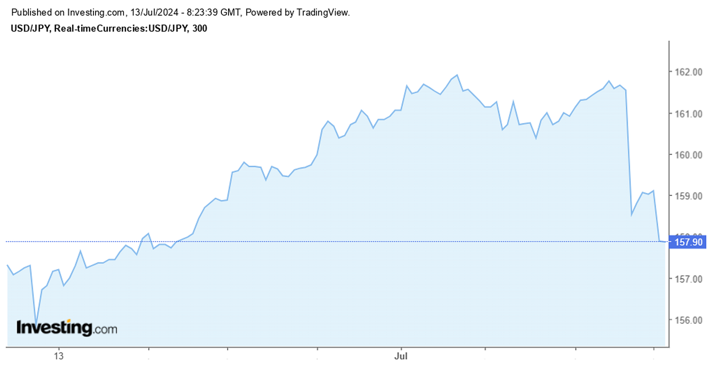 USD/JPY 在美国 CPI 公布后,随著狂跌的美债殖利率,下跌近 3%,最低来到 157.40, 创下自 2022 年底以来最大单日跌幅 ; 日本媒体将此归因于当局的一轮𧹒入 , 以支撑处在 38 年低点的日圆 。