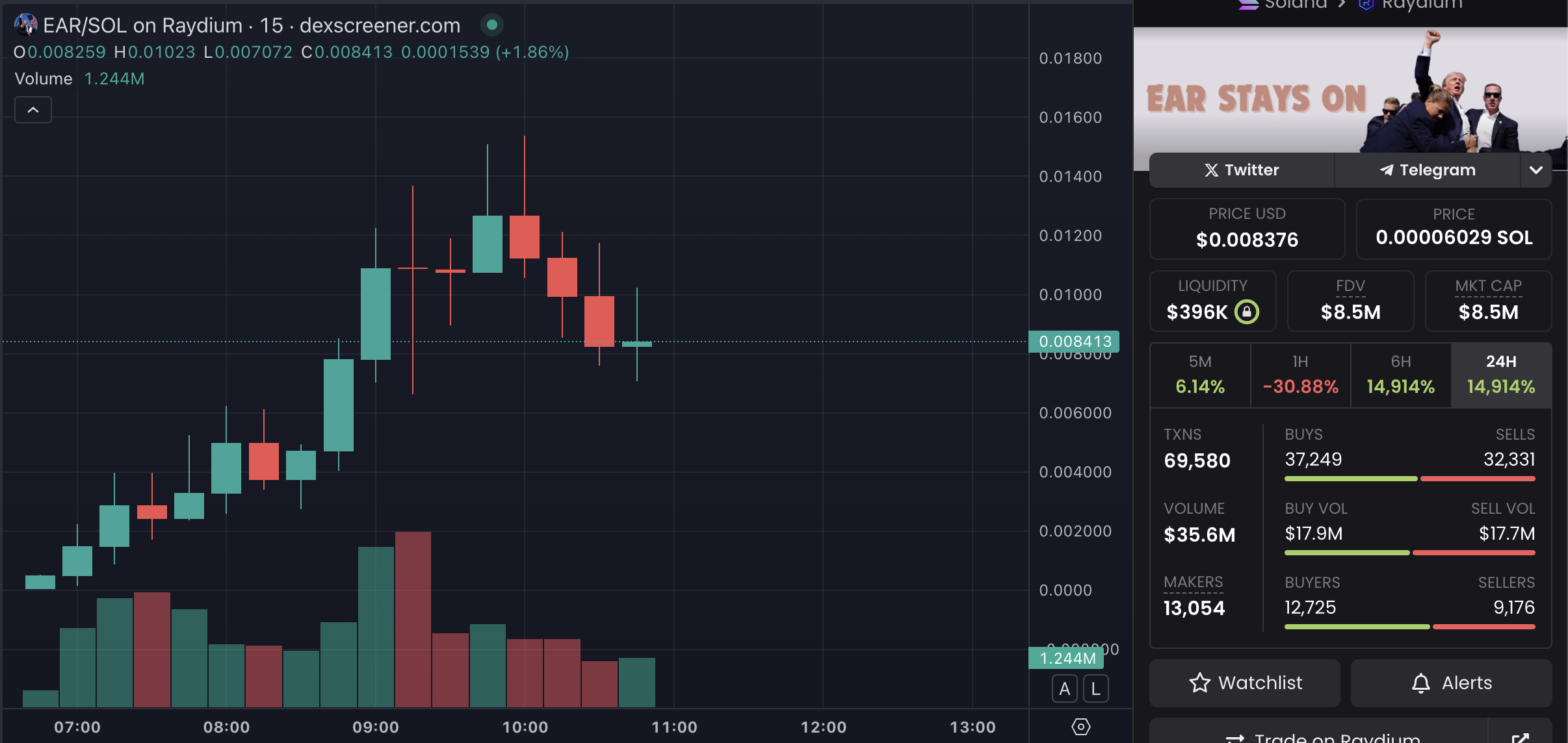 值得一提的是,加密市场对此消息很快地做出反应,不只是 TRUMP 价格很快地攀升 50% 至 9.5 美元,还有相关迷因币种也大量涌现,其中「耳朵还在(Ear Stays On)」受到眾人追捧,$EAR 6 小时内狂涨超过 15,000%,市值最高达 1,400 万美元,截稿前略有回落,下跌至 0.0084 美元。