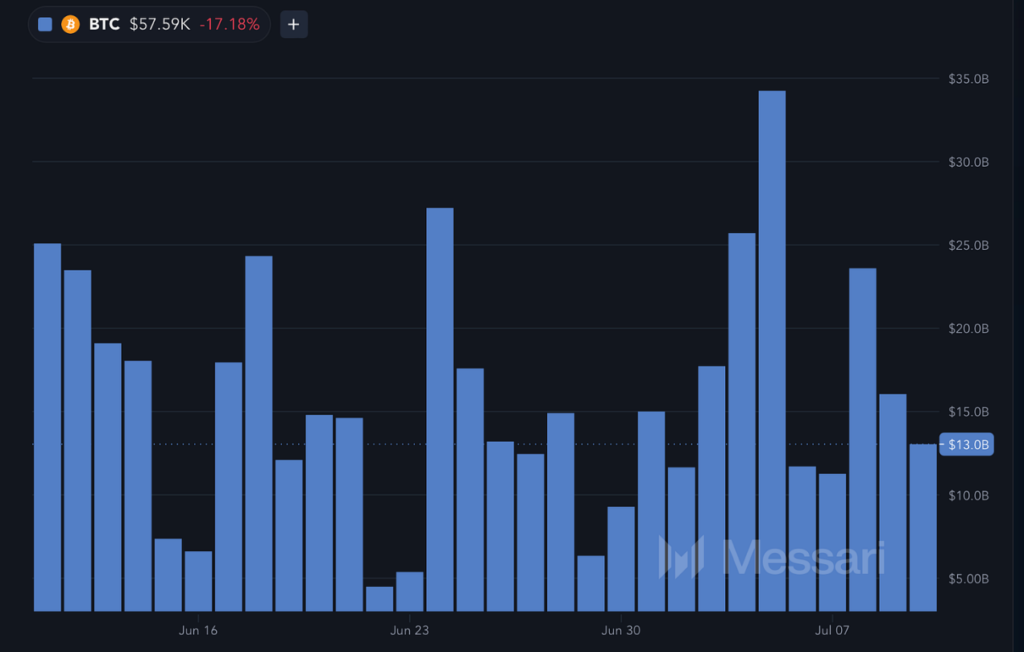 相对于整体市场,德国当局出售比特币的直接影响似乎很小。即使在资金大量流出的日子裡,比如 6 月 8 日,比特币流出约 7.4 亿美元(约 12.36 万枚比特币),与整体市场流动性相比,这一数额也很小。据 Messari 资料,实际交易量通常在 100 亿至 350 亿美元之间。总体而言,比特币市场的流动性很强。