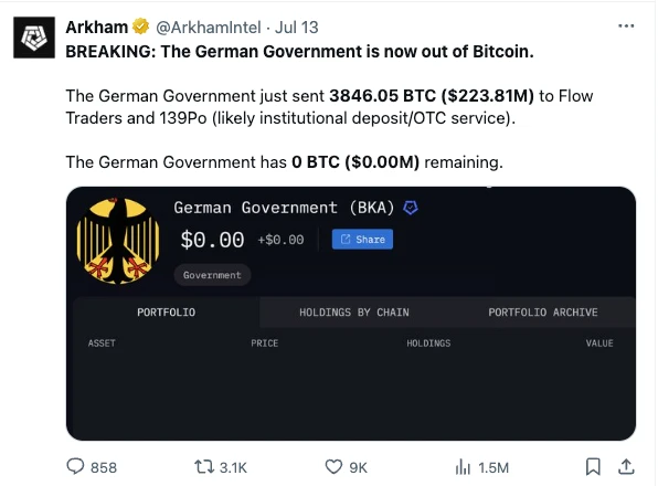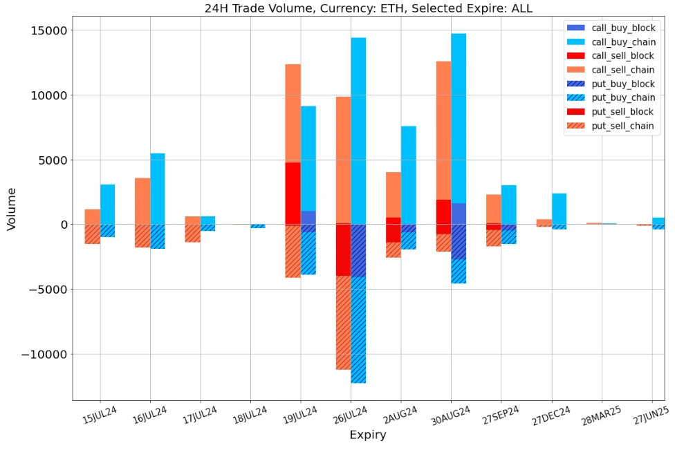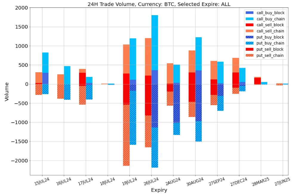 但话说回来,比特币这波回血功劳也不全在他。从 Farside Investors 提供的数据上看,近几天传统的资金通过 Spot ETF 重新注入到数字货币市场。一方面,即将到来的九月降息提供了宏观环境上的支撑,另一方面,根据 Arkham 的消息,德国政府目前已经无币可卖,BTC 在近期强烈的抛压下守住了五万底线的表现也让投资者对其价格的韧性更具信心,也为接下来即将面对的门头沟还款事件提供了预演。从期权的交易上看,过去 24 小时里投资者通过大量卖出短期的看跌策略(Short Put Spread,Short Put)表达了积极的情绪,较为有代表的有 BTC Short 26 JUL 62000 vs 58000 Put Spread(200 BTC per leg)和 ETH Short 26 JU L2 4 3300-P(3500 ETH)。但我们也注意到,BTC 八月上买 Put 策略数量也同样可观,交易员抓住了这次价格上行的机会买入了相对便宜的看跌期权为盈利的多头提供持续的保护。