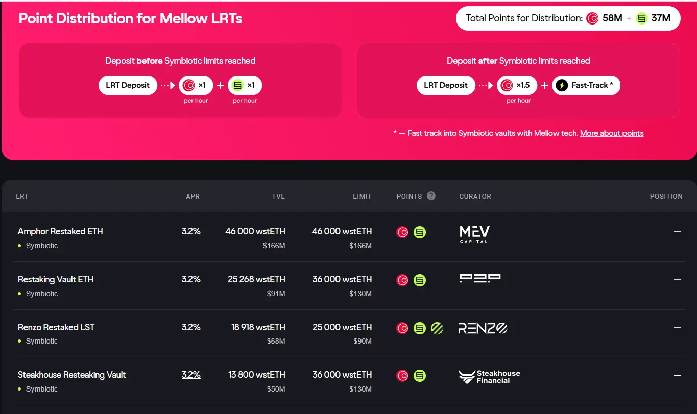 Mellow 原是一个流动性解决方案,是 Lido 联盟的合作伙伴,支持用户在平台上质押 ETH 可以获得 stETH,赚取额外的 Mellow 质押积分。另外,Mellow 还帮助 Lido 运营商推出自己的 LRT,以提高 stETH 的可用性并为 Lido DAO 成员增加收入。