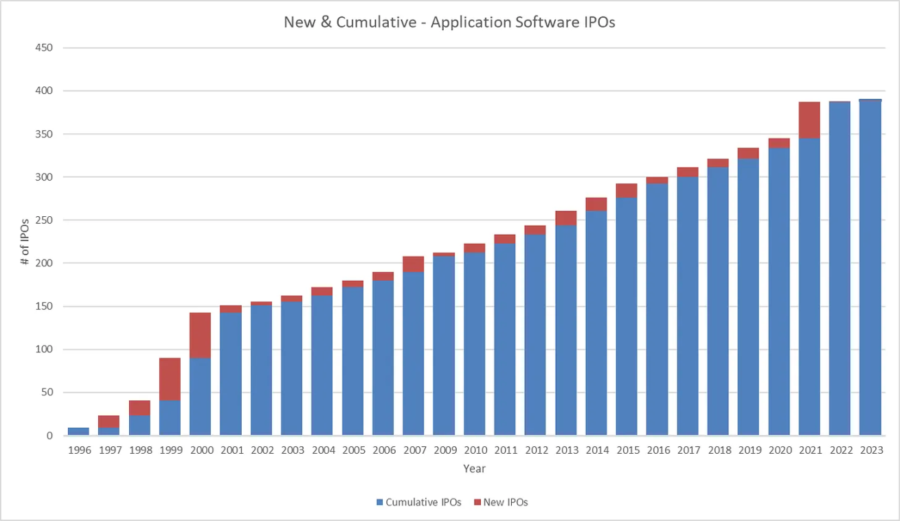 2、应用软件一直是不断给予的礼物,自 1996 年以来占所有 IPO 的 8% ,但它作为风险投资子行业正在成熟。鉴于此,可投资的市场机会正在缩小。