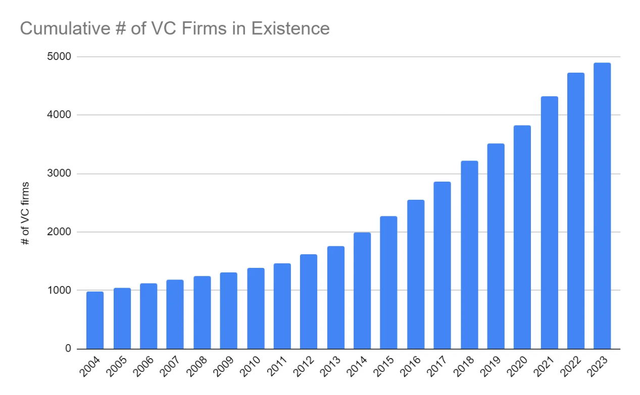 3、风险投资从未如此竞争激烈。过去 20 年,风险投资这个资产类别增长了四倍以上。这正体现了「你的利润率是我的机会」。