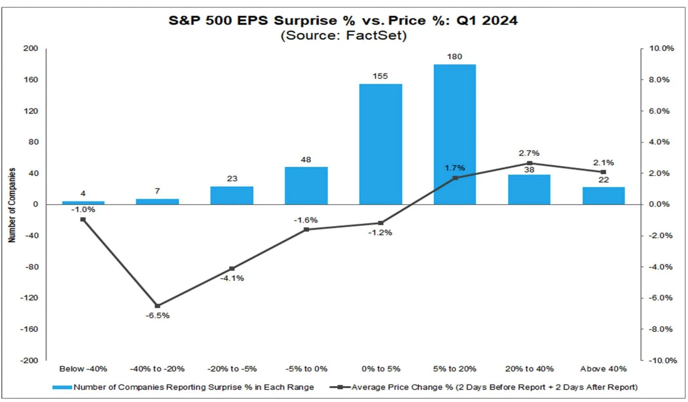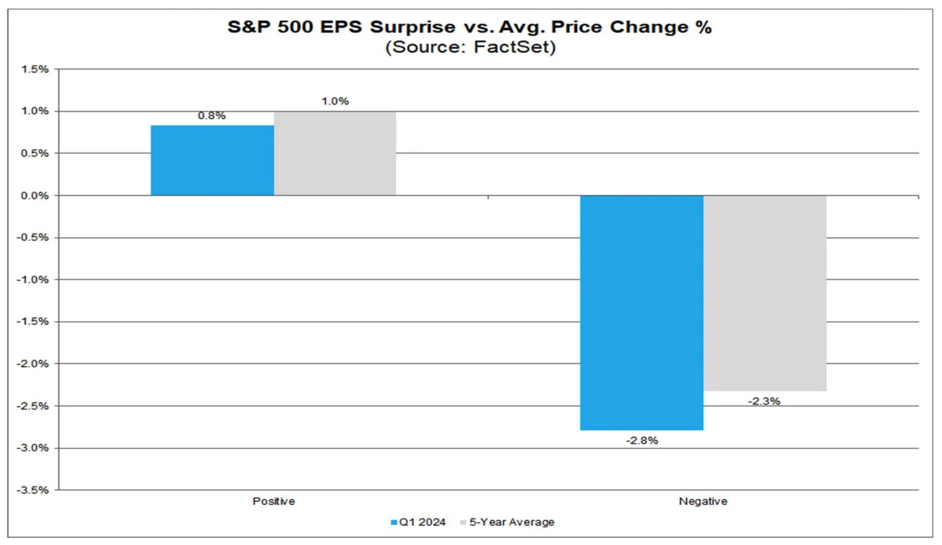 另外从一季度的市场短期反应来看,非常明显的好惊喜涨幅不如坏意外的跌幅 — — EPS 意外值为正的公司,其股价平均涨幅略低于五年平均水平。EPS 意外值为负的公司,其股价平均跌幅略大于五年平均水平。