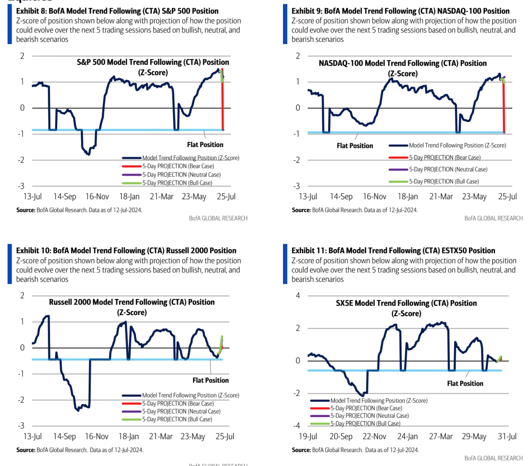 BofA 对不同股指的 CTA 头寸的分析和未来五个交易日的预测显示 S&P 500 头寸 Z-score 接近 2 ,头寸较高。NDXZ-score 接近 1 ,中等偏高水平,Russell 2000 头寸较为中性,上涨概率大。
