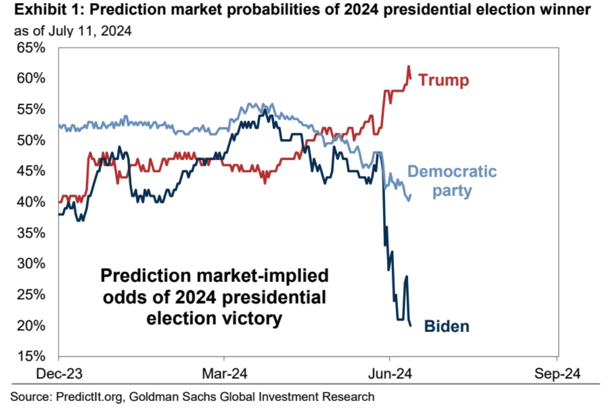 衍生品市场现在对拜登非常悲观,经过 6 月 27 日的辩论后,特朗普胜选的预测市场概率从年初的 40% -50% 跳升到大约 60% 。共和党拿下参众两院以及总统(sweep)的概率也有所增加,当前大约为 50% 。拜登胜选概率已经跌破 20% :