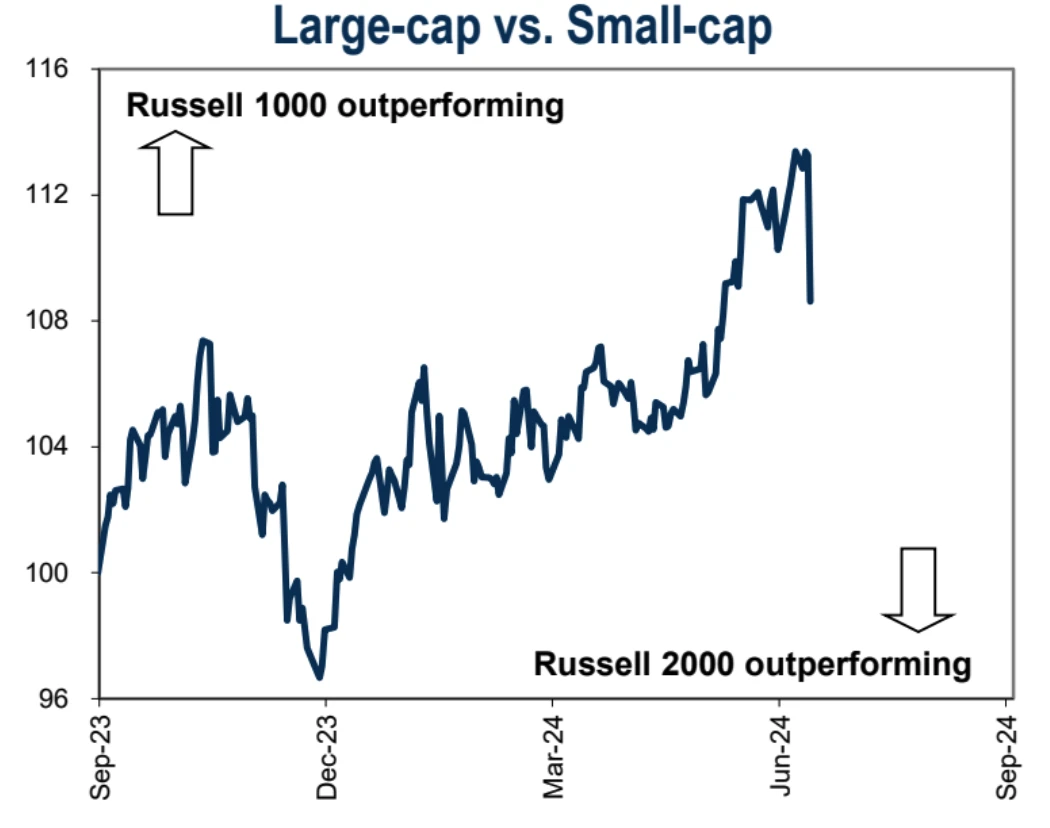 所以随着大科技股走出 2022 年业绩低谷,除了做硬件的 Nv 或 Tesla 在财报后依旧能保持强势的可能性越来越低。比较好的结果是板块切换从 Mag 7 切换到 the 493 (NDX 上周相对于 R 2 K 表现落后 6.3% ,是过去十多年最差的相对表现之一),或者炒作焦点能从从 AI 切换到分支赛道,包括人形机器人和自动驾驶等。