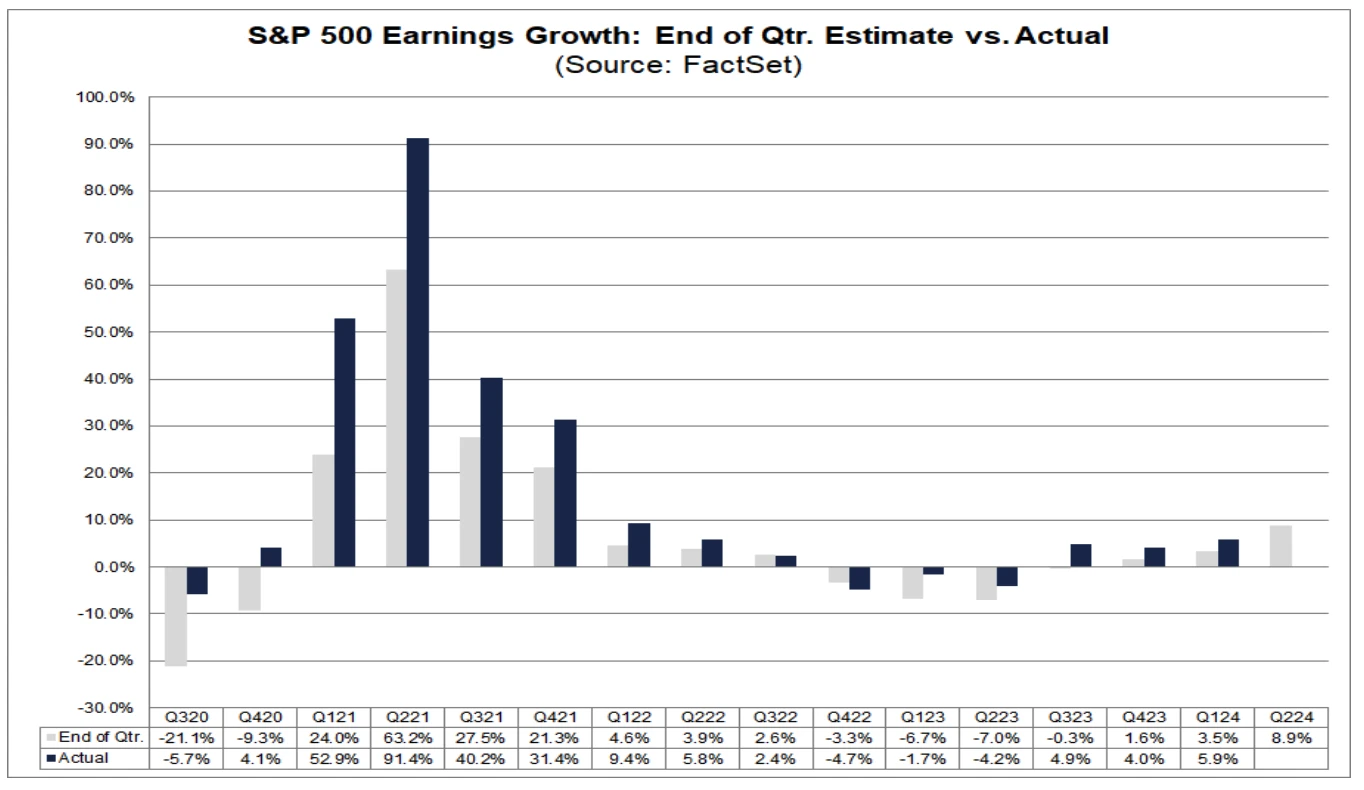 华尔街预期 Q2 标普 500 的盈利会同比增长 8.9% ,这要显著高于上个季度的 5.9% 。上次有如此高的盈利增长,还要追溯到 2022 年的Q1,也就是美联储刚开始加息的时候,那个时候的盈利增速为 9.4% ,值得一提的是, 8.8% 的盈利期待还是调低后的结果。3 月底的时候,分析师们普遍预计盈利增速是 9.1% 。
