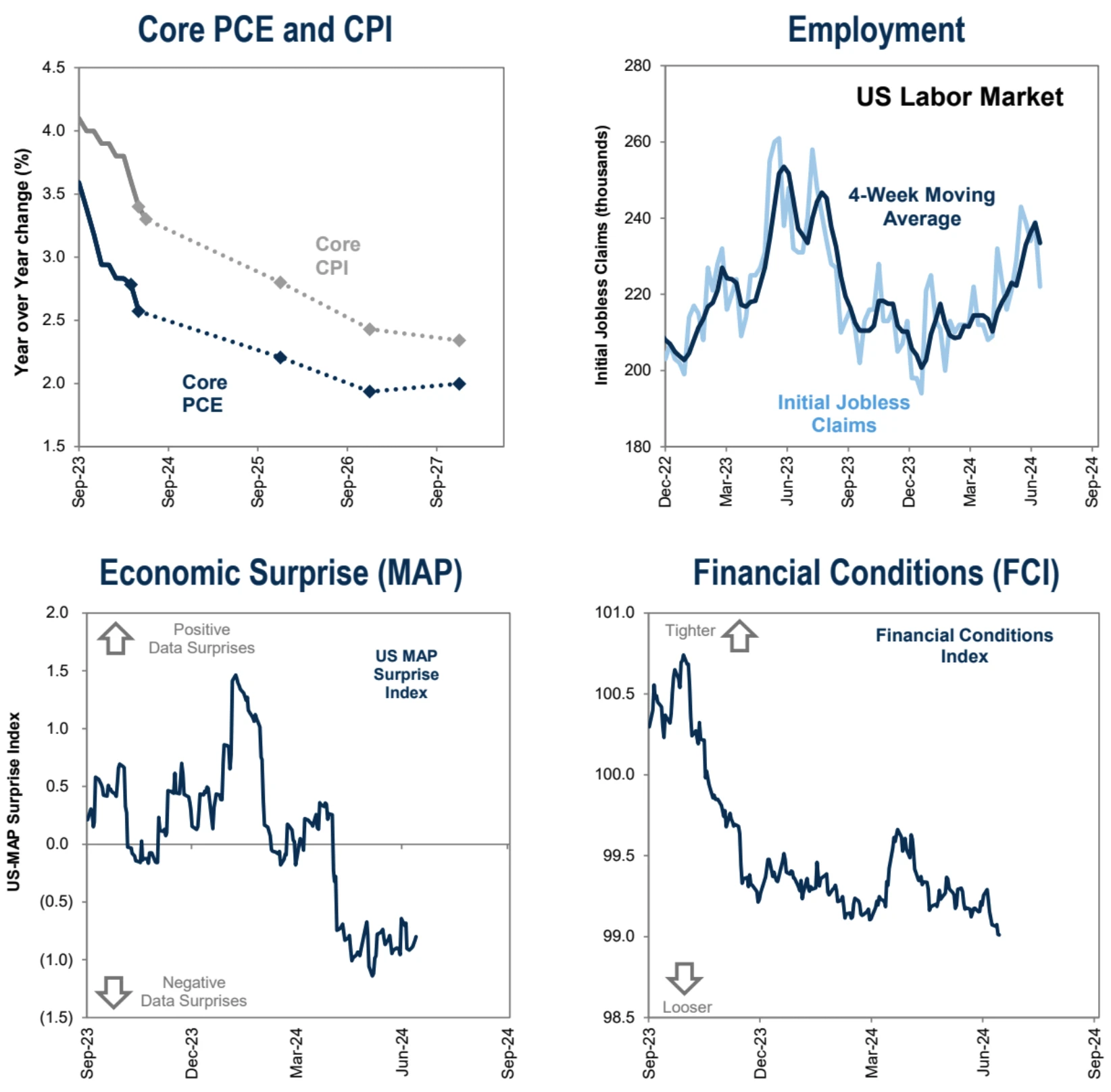 金融条件指数:显示出持续的宽松趋势,程度为 2022 年底以来最宽松 s。