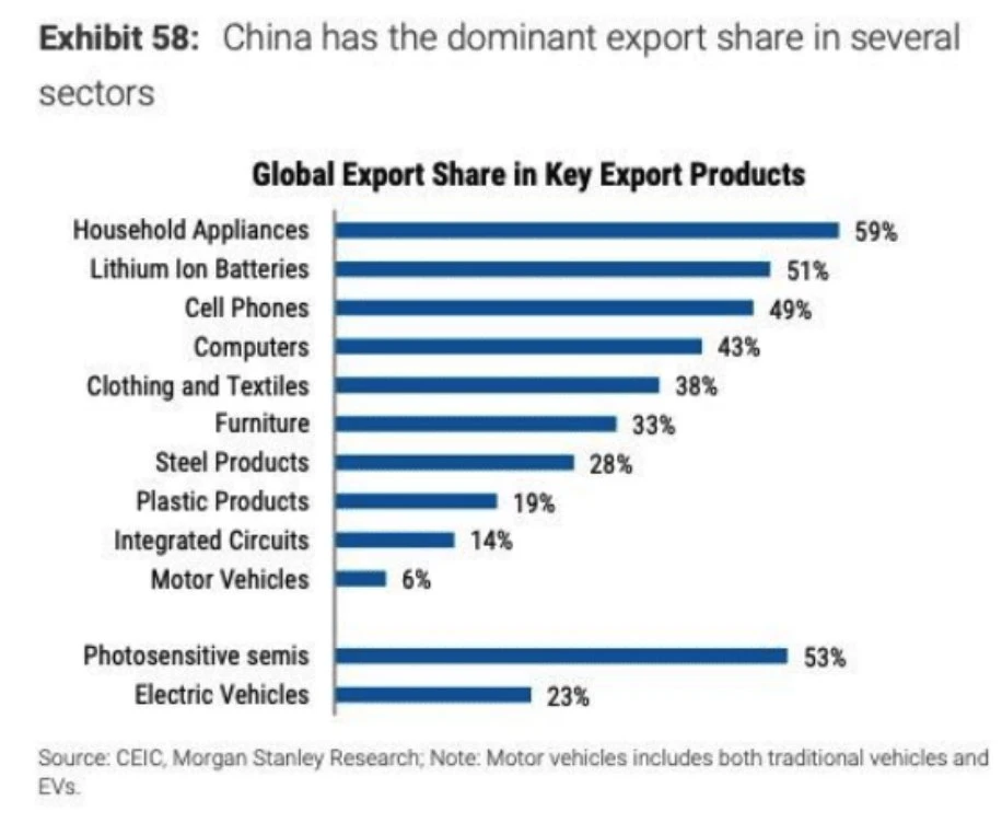 下图清晰地展示了中国在多个关键出口产品中占有显著市场份额。除了传统制造业领域仍然占据重要地位,如家电(59% )、服装和纺织品(38% )以及家具(33% )。此外中国在高科技领域的制造能力和技术水平显著提升,在锂离子电池和光敏半导体(摄像、太阳能)领域的市场份额分别达到 51% 和 53% 。: