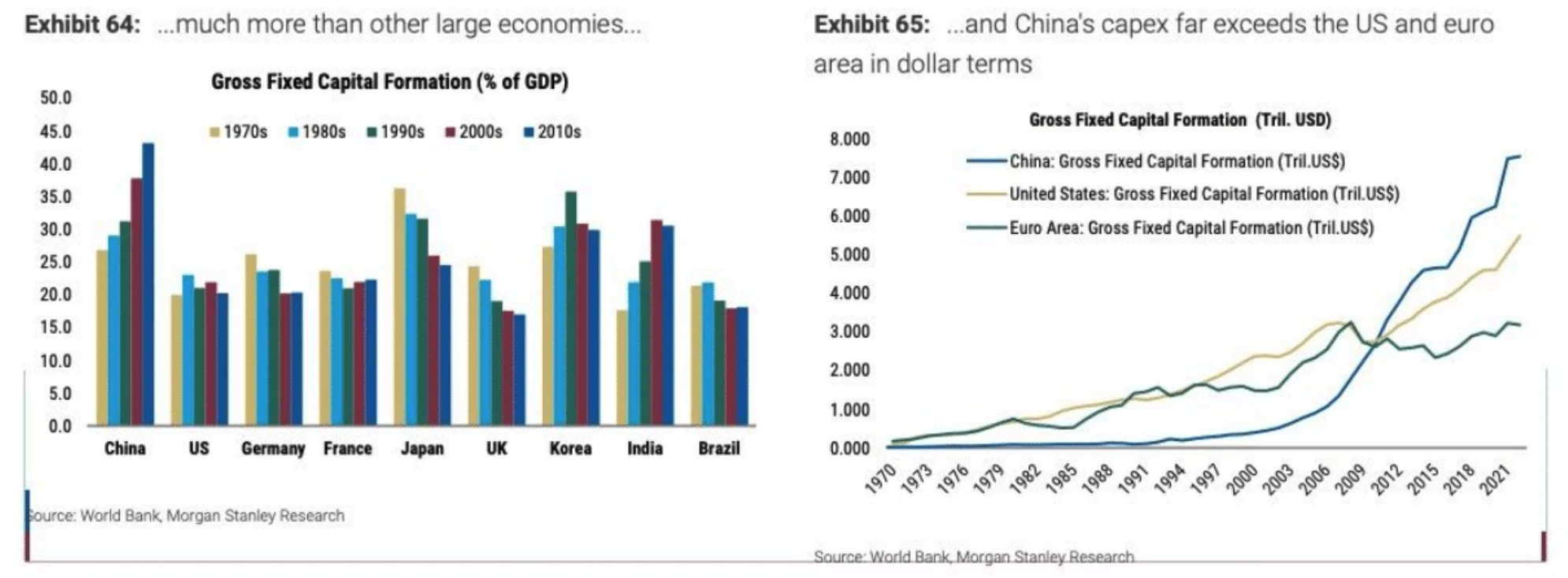 中国多年来采用投资驱动的经济增长模式,这种模式在短期内可以迅速提升生产能力和经济总量。下图可见中国的固定资本投资占 GDP 的比例显著高于消费支出。这表明大量资金被投入到建设新厂房、购买设备和扩展生产线等方面。这种模式可能超过市场需求的增长速度。