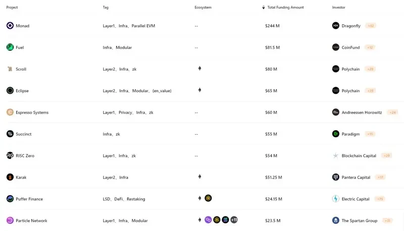 RootData 发布的Q3预计 TGE 项目列表中收录了 30 个大额融资、高 FDV 的明星项目,例如 Monad、Fuel、Scroll、Succinct 等,都有较大概率上线 Binance。