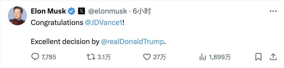 特斯拉创始人 Elon Musk (此前已明牌表示将支持共和党)就此表示:“恭喜 J.D. Vance,特朗普做了一个绝佳的选择。”