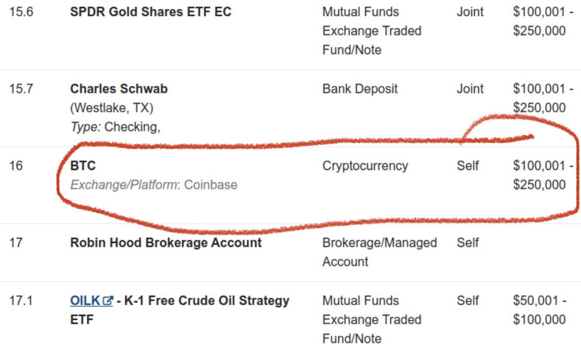 2023 年 10 月,J.D. Vance 作为参议员提交了 2022 年度的强制性财务披露报告。报告显示, 截至 2022 年 J.D. Vance 拥有价值 100001 美元至 250000 美元的比特币,并通过 Coinbase 持有着这些资产。