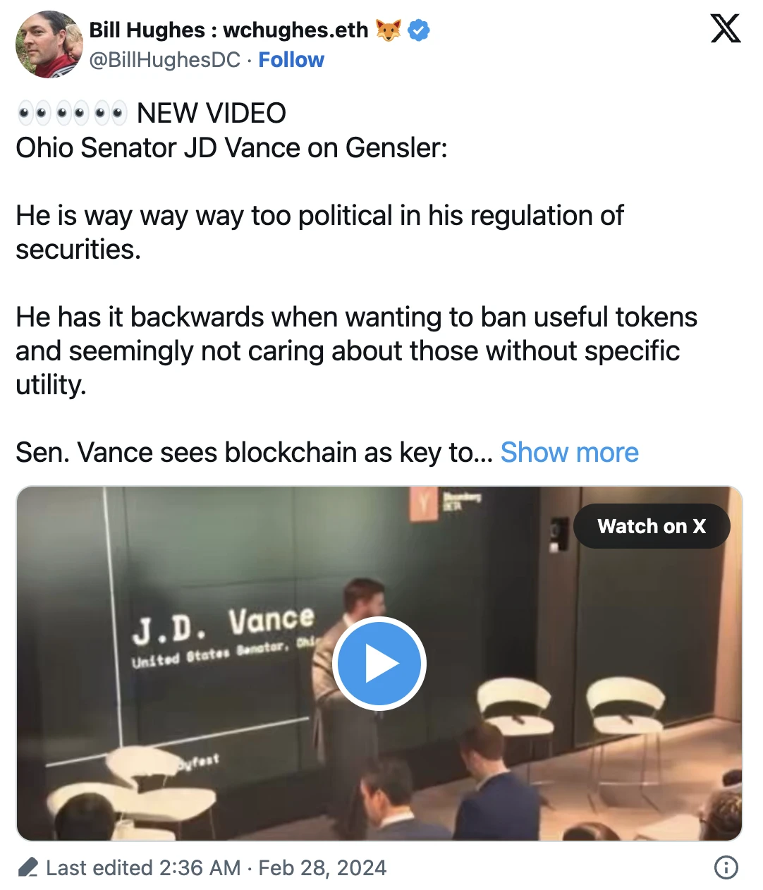 J.D. Vance 当时提到:“ 我认为(SEC)最糟糕的人选就是 Gary Gensler …… 他想把过多的政治因素注入到美国证券的实际业务中…… Gary 对区块链和加密货币的监管方式与其应有的方式完全相反。 ”