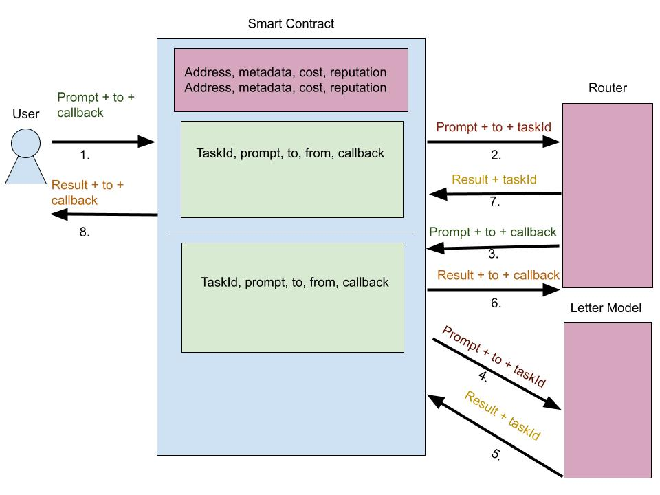 在操作方面,用户可以通过与前端交互来提交查询需求。这些查询会被提交给智能合约进行随机处理和事件广播。接收事件的路由会对其性质和所需任务进行分析,然后将任务分配给合适的专用模型。