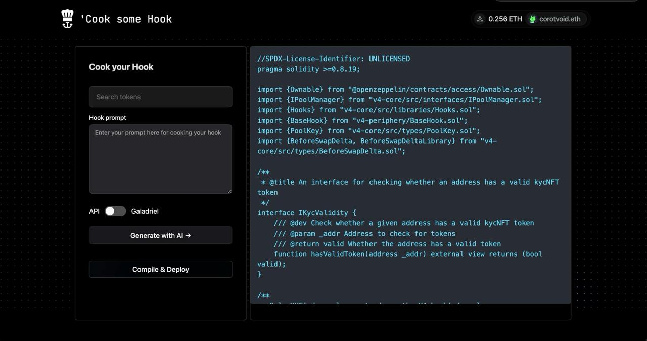 Cook some hooks 是一套开发者工具,它利用生成式人工智能(AI)帮助用户轻松创建和部署 Uniswap v4 的 hooks。通过这个工具,用户可以选择他们喜欢的 DeFi 应用(如 Uniswap 或 PancakeSwap),选择想要创建的交易对,然后利用 AI LLM 模型生成相应的 hooks。这些 hooks 可以部署在任何兼容 以太坊 虚拟机(EVM)的区块链上。