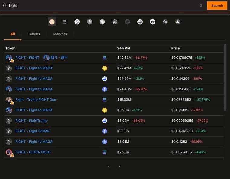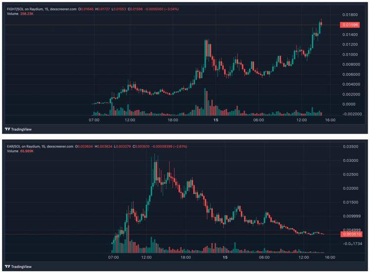 对于 meme 炒作来说,事件发酵、发币、拉盘已成基本程序。上述这些名称所代表的代币不仅 1 个,在任何 dex 上搜索其中任何一个词,都可以搜索到几十个同名代币。据 gmgn 数据,名为「Fight」的代币在 Solana 上有 24 个,在以太坊上有 23 个,而 EAR 在 Solana 上有 11 个,在以太坊上有 5 个。