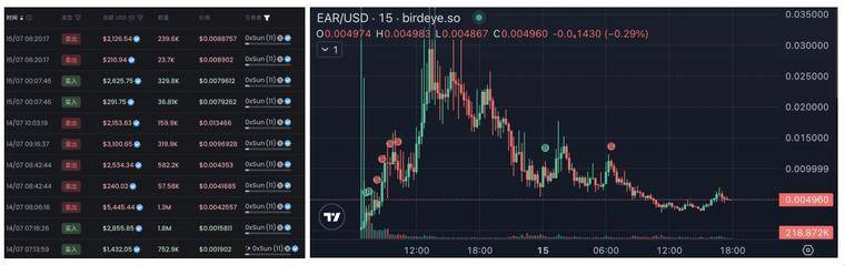 在 EAR 出现的 36 分钟后,一个显示为推特粉丝数超 90 K 的 KOL「0xSun」的地址以 0.0015 和 0.0019 美元分两笔买入共 2700 多美元的 EAR。这时 EAR 的市值还不到 200 万美元,在之后的 8 小时里,EAR 最高突破 3200 万美元。但 0xSun 并没有卖在高点,如果按高点计算,0xSun 最高盈利可达 16 倍。但在这波行情中,0xSun 的实际收益率为 1.36 倍。