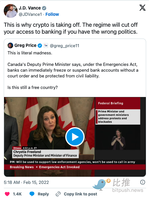 Vance 还批评了加拿大政府冻结与 2022 年渥太华卡车司机抗议活动相关人员的银行账户的决定。他当时发帖称:「这就是加密货币蓬勃发展的原因,如果你的政治观点错误,政权就会切断你获得银行服务的机会。」