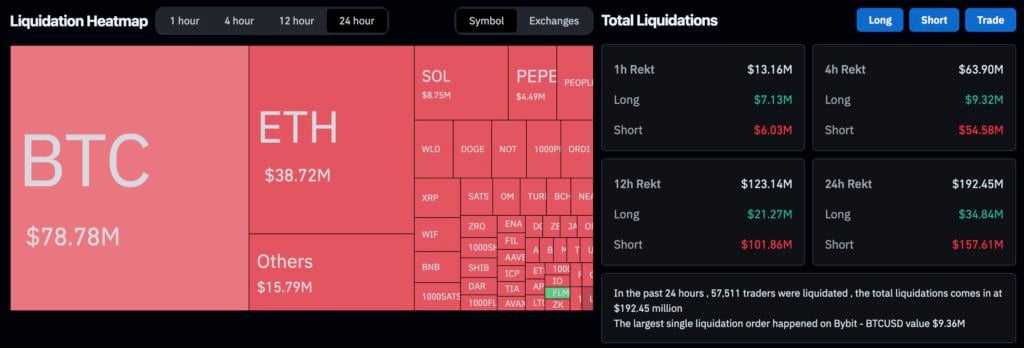 比特币拉涨的行情下,据 Coinglass 数据 显示,过去 24 小时,加密货币全网爆仓金额已破 1.9 亿美元,有超 5.7 万人遭清算(空军占 1.57 亿美元)。