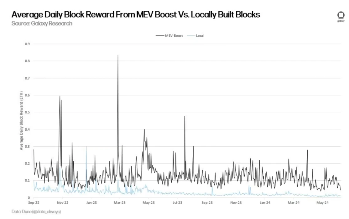 根据 Galaxy 的计算,MEV 可将验证者收益率提高约 1.2% 。与其他类型的验证者收入(包括新 ETH 发行和优先费用)相比,来自 MEV 的验证者奖励占比约为 20% 。一些人将 MEV 归因于给予区块提议者的额外价值,该价值不是来自优先费用或 ETH 发行。然而,另一些人认为,如果优先费用是通过成功的抢先交易或反向交易获得资金的,那么它本身可以代表 MEV 利润。为了解释优先费用本身可能包含 MEV 的事实,其他方法比较了通过 MEV-Boost 软件构建的区块和未通过 MEV-Boost 软件构建的区块的价值。