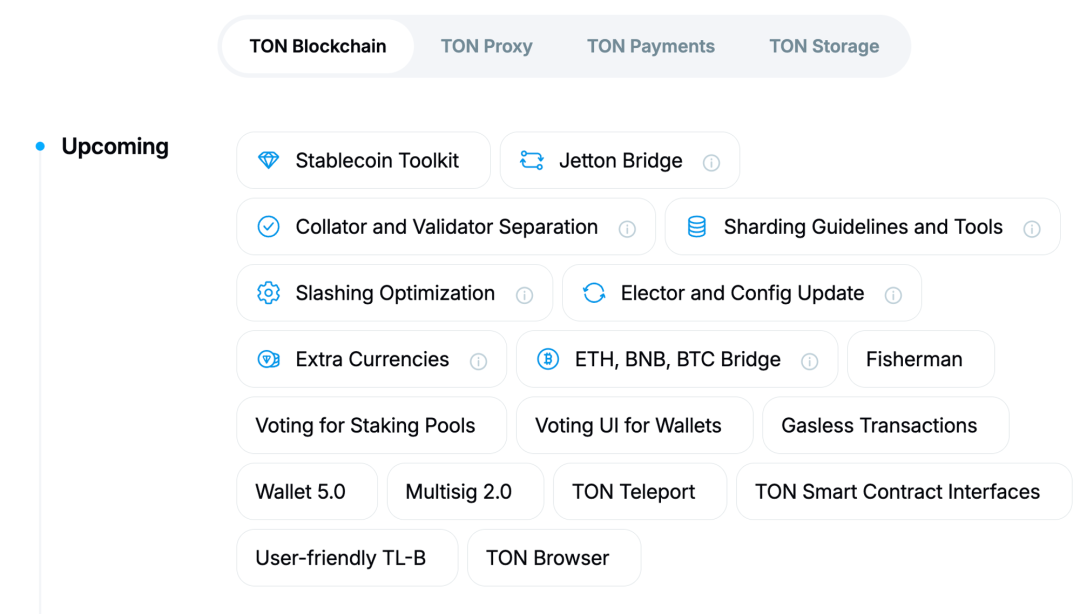 其中第一二点是最基本的跨链桥与其他大宗资产的支持,2024 Q2 Ton 链上的 TVL 爆发性成长从 100M → 700M 的过程中原生 USDT 的支持是最大的引爆点,而笔者认为下一阶段要突破 1B TVL 的关键便是其他主流资产 BTC、ETH 的支持,并且搭配更多的第三桥提供流动性,而这也是目前 Ton 基金会路线图所述下一季度的发展目标。