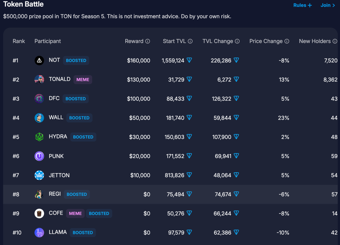 最后来说说最近开始的 The Open League 第五季的竞赛,老实说笔者对于目前为止 Ton Defi 项目有点失望,参赛的协议不过六个并且与第四季的参赛协议一模一样,完全没有新项目的加入,而对于已发币项目而言也仅有 NFT 借贷协议 DAOLama 代币 $LLAMA 挤进前十。