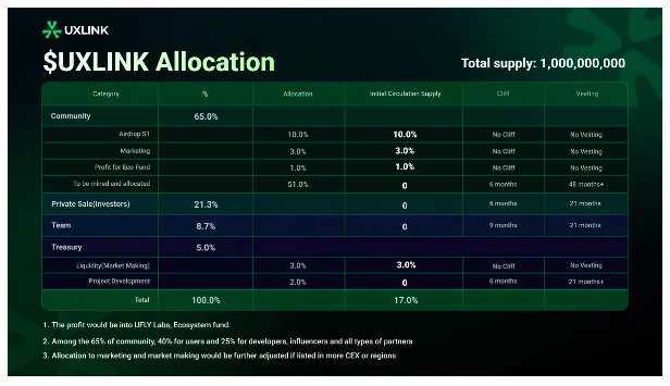 基于 UXLINK 白皮书, 65% 将分配给社区,其中 40% 给用户, 25% 给生态的开发者和合作伙伴。