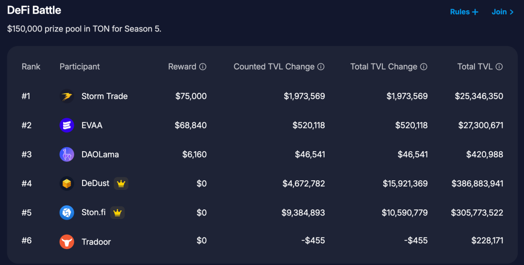 最后来说说最近开始的 The Open League 第五季的竞赛,老实说笔者对于目前为止 Ton Defi 项目有点失望,参赛的协议不过六个并且与第四季的参赛协议一模一样,完全没有新项目的加入,而对于已发币项目而言也仅有 NFT 借贷协议 DAOLama 代币 $LLAMA 挤进前十。