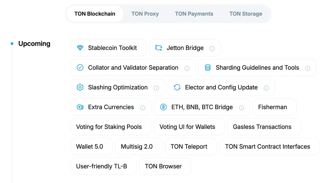 其中第一二点是最基本的跨链桥与其他大宗资产的支持, 2024 Q2 Ton 链上的 TVL 爆发性成长从 100 M → 700 M 的过程中原生 USDT 的支持是最大的引爆点,而笔者认为下一阶段要突破 1 B TVL 的关键便是其他主流资产 BTC、ETH 的支持 ,并且搭配更多的第三桥提供流动性,而这也是目前 Ton 基金会路线图所述下一季度的发展目标。